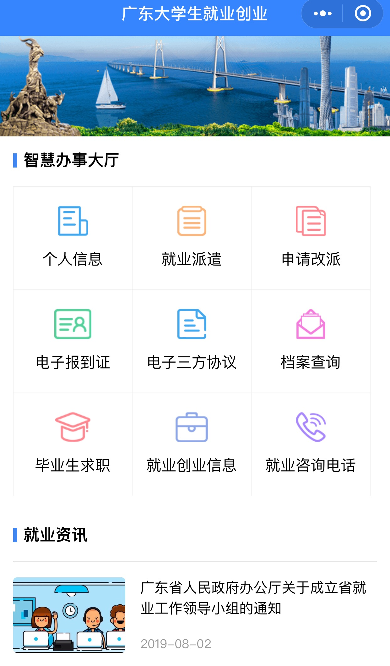 根据广东省教育厅相关要求,为做好2020届毕业生就业管理与服务工作,推广使用广东省高校毕业生就业创业智慧服务平台(以下简称就业服务平台),请2020届毕业生于10月16日前关注“广东大学生就业创业”官方微信公众号,进行毕业生生源信息绑定(操作流程详见后文介绍)。毕业生绑定生源信息后,可通过就业服务平台学生端办理就业信息上报、电子报到证、申请改派、电子三方协议、档案查询、毕业生求职等就业手续。该平台对于毕业生非常重要,务必认真按指南逐条填写: