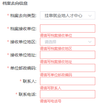 档案接收单位、接收单位地区、接收单位地址、单位邮政编码、联系人都必须按接收函上的信息填写。