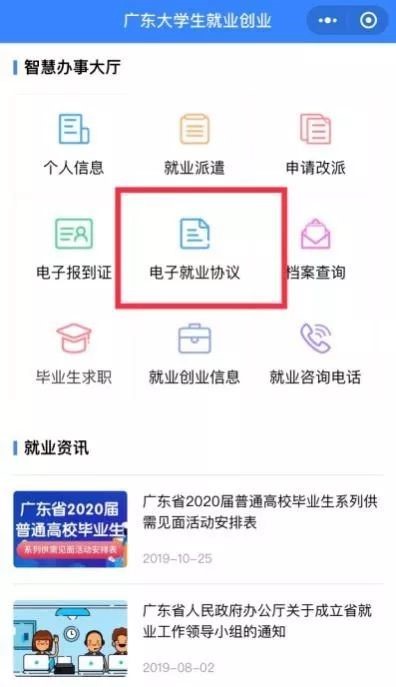 关注微信公众号“广东大学生就业创业”,进入“办事大厅”后点击“电子就业协议” “填写就业协议”模块创建就业协议。