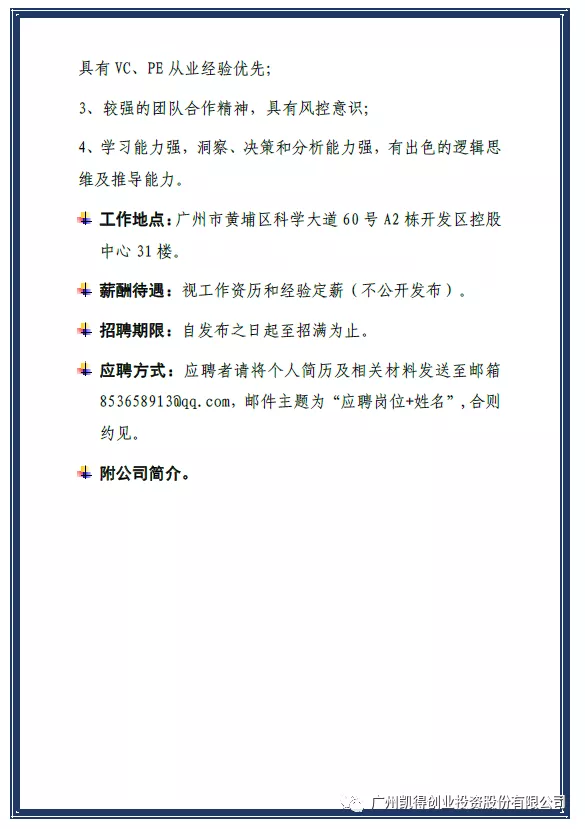 招聘信息 | 广州凯得创业投资股份有限公司