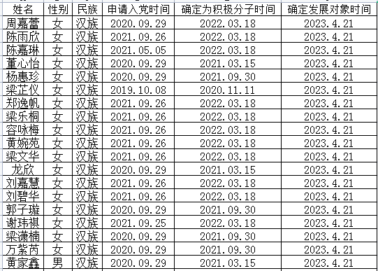 经发展对象知识培训,且对该同志本人及其家庭成员、主要社会关系政审且无政治历史问题,支部委员会研究决定,近期拟召开党支部大会讨论吸收周嘉蕾等19名同志为中共预备党员。现将基本情况公示如下: