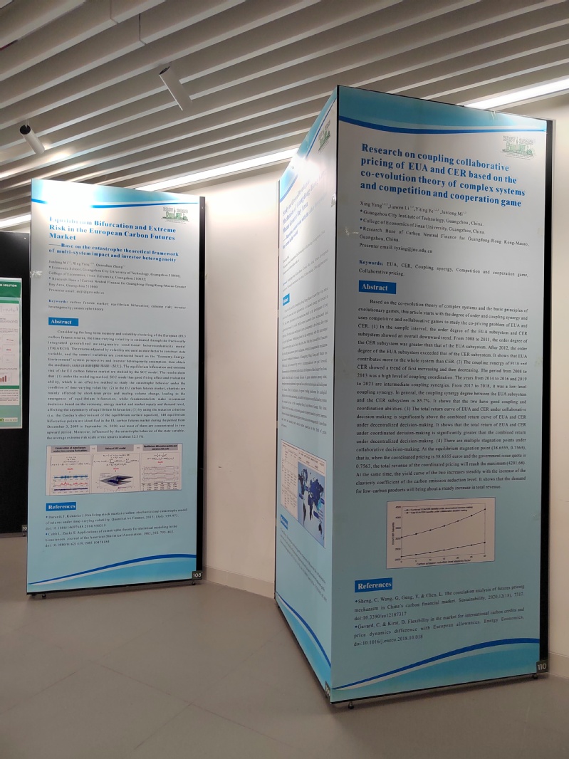 我校122cc太阳集成游戏提供“Equilibrium Bifurcation and Extreme Risk in the European Carbon Futures Market——Base on the catastrophe theoretical framework of multi-system impact and investor heterogeneity”、“Research on coupling collaborative pricing of EUA and CER based on the co-evolution theory of complex systems and competition and cooperation game”、“Study on Green Development Mechanism of Guangdong-Hong Kong-Macao Greater Bay Area —— Based on comparison with the other three major bay areas in the world”3篇学术论文被安排在会议现场突出位置进行展示。