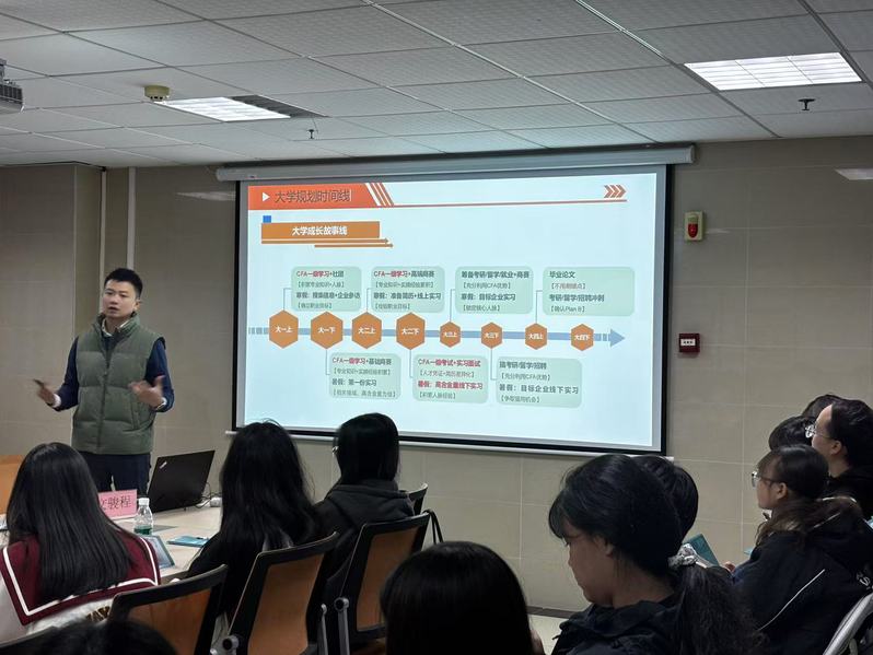 在经济类证书考证规划介绍环节。文骏程老师针对经济类专业各类热门证书,如注册会计师(CPA)、金融分析师(CFA)、特许公认会计师(ACCA)等,进行了全面而细致的解读。从证书的考试内容、报名条件、考试难度到证书的含金量和职业认可度,一一为同学们进行了详细的介绍和分析。文骏程老师指出,证书虽然不是衡量个人能力的唯一标准,但在求职过程中往往能起到敲门砖的作用,帮助同学们在众多求职者中脱颖而出。同时,也提醒同学们要理性看待考证,避免盲目跟风,应根据自己的职业规划和实际情况选择适合自己的证书,并制定科学的备考计划。