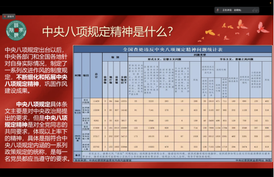 会上,赵晓灿以中央八项规定精神为切入点,进行了深入细致的讲解。她不仅详细阐述了中央八项规定精神的具体条文内容,还对其延伸意义和核心要义进行了深刻剖析。赵老师谈到,中央八项规定精神是党内作风建设的重要准则,其内在要求的拓展和升华,为党员、干部提供了更具普遍性和指导性的行为规范。全体毕业生党员要深入贯彻落实中央八项规定精神,时刻牢记初心使命,以更高的标准严格要求自己,在日常生活和工作中,切实发挥模范带头作用,成为群众的贴心人和引路人。